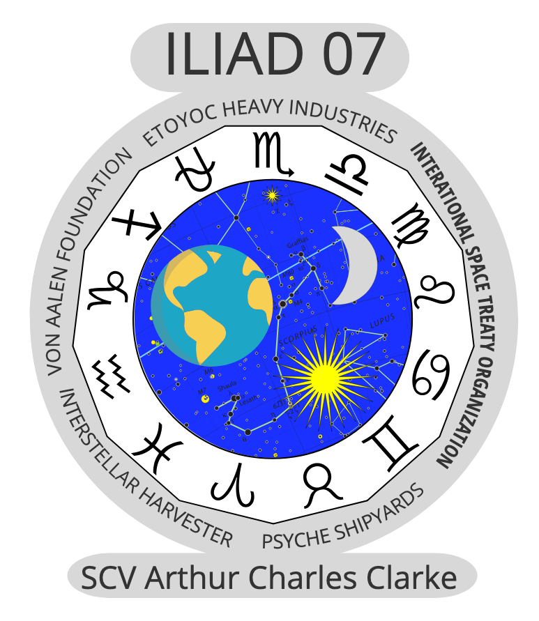 From there I added a starfield with the constellation Scorpio, and highlighted the star 18 Scorpii. 18 Scorpii is Iliad-07 mission's intended destination. And then I figured the corporate sponsors would want all of their names kind of tacked on. And at the last minute. And to make the whole thing look superficially resemble mission patches from 20th century space programs.