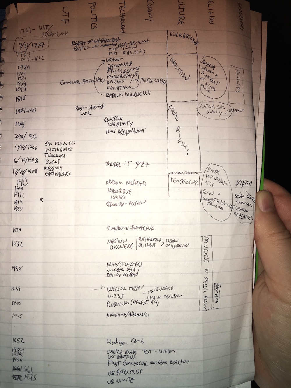 It's a great talk, definitely worth the watch, but at the risk of summarizing a brilliant summary: History is Complicated. And I don't think I respected that enough when I set out with my ambitious plan to rewrite history from 1777 and on. Here is a rough sketch I made on the history of Nuclear Power in our own timeline:
